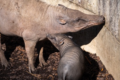 Bereits im November 2025 ist in der Wilhelma ein weibliches Ferkel bei den Hirschebern zur Welt gekommen. Besonders an warmen Frühlingstagen ist der Nachwuchs immer häufiger gemeinsam mit dem Muttertier auf der Außenanlage zu beobachten.