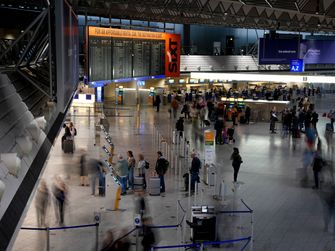 Reisende stehen am Freitag am Flughafen Frankfurt vor einer Anzeigetafel mit gestrichenen Flügen