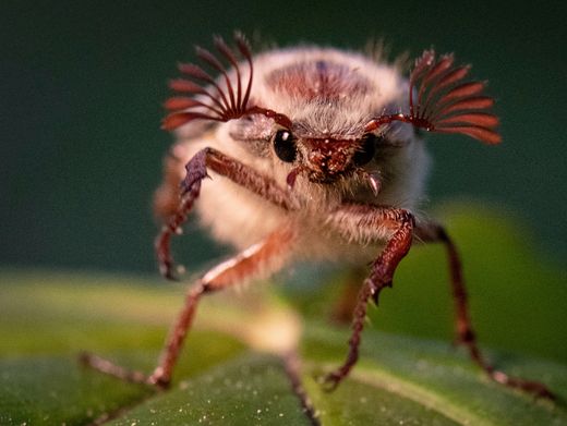 Ein Maikäfer krabbelt über ein Blatt