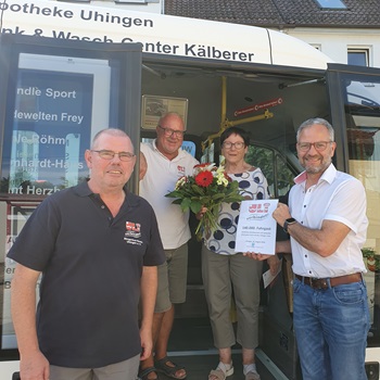 Doch was wäre der Bürgerbus ohne seine Fahrgäste? Als Anneliese Düring am vergangenen Montag in den Bürgerbus einstieg,um sich vom Bahnhof nach Hause fahren zu lassen,ahnte sie noch nicht,was gleich passieren würde. Das Empfangskomitee des Bürgerbus-Vereins Uhingen e. V.,bestehend aus dem 1. Vorsitzenden,Bürgermeister Matthias Wittlinger,dem 2. Vorsitzenden und Fahrer Wolfgang Euchner und dem Kassier Matthias Jüngling,begrüßte sie persönlich und gratulierte ihr. Sie nahmen den 140.000sten Fahrgast der Uhinger Bürgerbus-Linie in ihre Mitte und überreichten ihr zur Feier des Ereignisses einen Blumenstrauß sowie eine 10er-Fahrkarte. „Wir wünschen Ihnen und allen unseren Fahrgästen weiterhin allzeit gute Fahrt im ULi-Bus“,so Bürgermeister Matthias Wittlinger,bevor es für Anneliese Düring im ULi fahrplanmäßig weiterging.