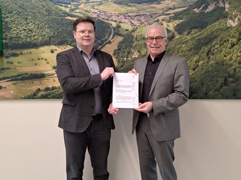 Landrat übergibt Zuwendungsbescheid für die Beseitigung von Hochwasserschäden symbolisch an Bürgermeister Keller aus Ebersbach an der Fils