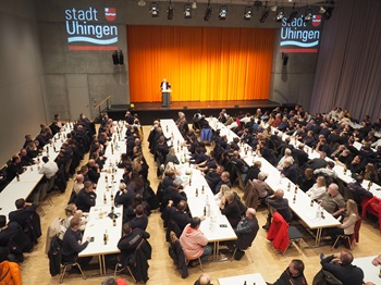 Es waren beängstige Szenen mitten Uhingen,die sonst nur in den Nachrichten zu sehen sind,wenn von heftigen Unwetterereignissen in anderen Teilen der Welt oder Deutschlands berichtet wird. Doch im Juni befanden sich einerseits viele Gemeinden entlang der Fils im Landkreis Göppingen im Ausnahmezustand – und Uhingen aufgrund der extremen Hochwasser- und Starkregen-Ereignisse im Speziellen. 500 Rettungskräfte aus dem gesamten Landkreis und benachbarten Landkreisen rückten nach Uhingen aus,um die große Katastrophe mit Menschenopfern zu verhindern. Bauunternehmen stellten großes Gerät und nach dem Unwetterwochenende packten ehrenamtliche Helfer voller Tatendrang an. „Ich bin tief beeindruckt von dem,was Sie alle geleistet haben“,wandte sich Uhingens Bürgermeister nun kürzlich an die Helfer. Und davon waren es einige: Von den mehr als 500 Frauen und Männern,die die Stadt Uhingen zu einem zünftigen Helfer-Vesper ins Uditorium eingeladen hatte,waren mehr als 300 gekommen. „Ich bin aber auch beeindruckt davon,dass Sie heute hier so zahlreich vertreten sind“,zollte der Bürgermeister den Anwesenden Respekt.Und es war wirklich ein beeindruckendes Erlebnis,so viele Rettungskräfte unterschiedlicher Feuerwehren,verschiedener Ortsverbände des Technischen Hilfswerks,der Malteser sowie Bürgerinnen und Bürger zu sehen,die nicht in konzentrierter Anspannung in einer schier unüberschaubaren Situation den Überblick behielten. Nein,völlig entspannt genossen sie einen Abend,der zwar den Hochwasser und Starkregen-Ereignissen in Uhingen und den Stadtteilen geschuldet war,nun aber im Zeichen des Dankes und der Geselligkeit stand. „Wir sind für solche Großeinsätze des Dankes nicht gerüstet“,gestand Uhingens Stadtoberhaupt mit einem Augenzwinkern: „Wir werden Einweiser zum Parken benötigen,wenn wir das nächste Helfer-Vesper veranstalten – nur diesmal ohne Hochwasser oder andere Unwetterereignisse.“ Denn das letzte Mal,dass so viele Rettungskräfte und Einsatzfahrzeuge in Uhingen anzutreffen waren,war im Juni. Wer am Abend des Helfer-Vespers in Uhingen einkaufen war,hätte angesichts der schieren Anzahl an Feuerwehr-,THW- und Malteser-Fahrzeugen den Eindruck erhalten können,in Uhingen findet eine Rettungskräfte-Tagung des Landes statt.Doch nicht nur Rettungskräfte befanden sich unter den Anwesenden,sondern auch engagierte Bürgerinnen und Bürger,die in den Tagen nach dem Hochwasser bei betroffenen angepackt und beispielsweise vollgelaufene Keller ausgeräumt haben. Auch Gastronomen aus Uhingen waren eingeladen,da sie während des Unwetters die Einsatzkräfte mit Essen und Getränken versorgt hatten. „Sie kamen von den Einsätzen vor Ort und mussten sich keine Gedanken darüber machen,wo sie etwas zum Essen herbekommen: Es wurde geliefert und hat alle zusätzlich motiviert“,bemerkte Matthias Wittlinger. Und auch Mitarbeitende der Stadtverwaltung,die beim Unwetter-Wochenende außerhalb ihrer Arbeitszeiten im Krisenstab und vor Ort beispielsweise im Stadtteil Holzhausen die Maßnahmen mit den Rettern abstimmten und in den darauffolgenden Tagen die Hilfsanfragen von Betroffenen sowie engagierten Menschen koordiniert haben. „Es ist mir ein sehr großes Anliegen,Danke zu sagen. Es war beeindruckend zu sehen,was man gemeinsam leisten kann“,wandte sich Uhingens Bürgermeister an die mehr als 300 Menschen im Uditorium. „Es waren so viele Menschen,so viele Trupps im Einsatz und alle haben sich auf ihren Aufgabenbereich konzentriert.“Und beim Helfer-Vesper,aufgetischt von den Mitgliedern des Fischereivereins,dürften die meisten Anwesenden erstmals – fast 6 Monate nach den heftigen Ereignissen – einen Gesamtüberblick über das gesamte Ausmaß von Hochwasser und Starkregen erhalten haben. Denn Uhingens Feuerwehrkommandant Steffen Kwiatkowski schilderte das dramatische Wochenende aus Sicht des Einsatzleiters,der zahlreiche Maßnahmen und Hilferufe koordinieren musste. „Am Ende des Wochenendes hatten wir in ganz Uhingen 335 Einsatzstellen und alleine unsere Uhinger Kameradinnen und Kameraden haben 4034 Einsatzstunden geleistet.“Die geographische Lage von Uhingen im mittleren Filstal bringe einen Nachteil mit sich,sagte der Kommandant: „Was im Oberen Filstal als Niederschlag herunterkommt,kommt bei uns an.“ Schon am Freitagmorgen veranlassten die Verantwortlichen im Rathaus die ersten Schutzmaßnahmen wie etwa den Aufbau eines Schutzwalls am Lessingweg. Als der Pegel der Fils am Freitagabend gegen 21.30 Uhr zirka 250 Zentimeter betragen habe,wurden deshalb erste Maßnahmen eingeleitet,die eigentlich erst bei einer Pegelhöhe ab 300 Zentimetern ergriffen werden. „Wir haben sie früher ergriffen,weil wir wussten,was auf uns zukommt“,sagte der Kommandant.Vollgelaufene Keller,eine über die Ufer tretende Fils,Sturzbäche,Schlammwellen,Blaulicht,ratternde Pumpen,Schlafmangel,durchnässte Kleidung,unbelehrbare Schaulustige,Evakuierungen,Erdrutsche – bis in die frühen Morgenstunden des Montags herrschte Ausnahmezustand in Uhingen. „Am Sonntag gab es mittags im gesamten Landkreis Göppingen keine Sandsäcke mehr“,verdeutlicht Steffen Kwiatkowski die dramatische Lage. „Wir haben massiv Überlandhilfe angefordert.“ Die eine Hälfte der Rettungskräfte des Landkreises Göppingen war in Uhingen,die andere in Ebersbach. „Wir waren Gott froh über die Kräfte aus anderen Gemeinden“,zeigte sich der Kommandant auch Monate später dankbar. Denn am Montagmoren wurden die Uhinger Einsatzkräfte für 6 Stunden zum Zwangsschlafen geschickt,nachdem sie 3 Tage am Stück durchgemacht hatten. „Nach so einem Dauereinsatz kann die Einsatzbereitschaft irgendwann einfach nicht mehr aufrechtgehalten werden“,erklärte er. Dann hätten auswärtige Feuerwehren in Uhingen die Hochwasser-Einsätze abgearbeitet und die den Fall eines Brandes nötige Grundsicherung übernommen.Zugleich räumte Steffen Kwiatkowski auch mit einem Gerücht auf,das seit dem Unwetter durch Uhing
