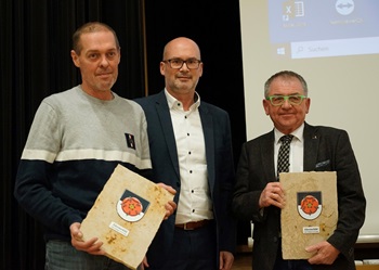 Zum Abschluss überreichte Oberbürgermeister Frank Dehmer beiden Geehrten den Ehrenschild der Stadt als Zeichen der Anerkennung.
