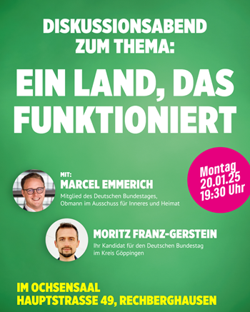„Ein Land, das funktioniert“ Gesprächsabend mit Grünen-Kandidat Franz-Gerstein und MdB Emmerich in Rechberghausen