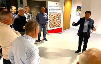 Bevor die Mittelständler mit Heininger über Themen der kommunalen Wirtschaftspolitik diskutierten,führte der OB die Gruppe durch das Rathaus,berichtete über dessen Bauausführung,technische Einrichtungen – auch zum Umwelt- und Klimaschutz – aber auch über die Raumaufteilung. Mit Blick auf die wachsenden Aufgaben einer Stadt sei das Rathaus schon an seine Kapazitätsgrenzen gekommen und müsste eigentlich erweitert werde. Vorerst begnüge man sich jedoch damit,durch Umwidmung von Räumen und mehr Homeoffice mehr Platz für Schreibtische und Mitarbeiter zu bekommen.