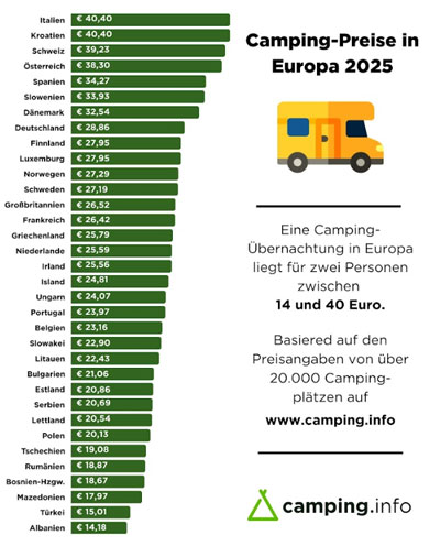 Wie viel zahlen Camper 2025 für eine Übernachtung in Europa? Das Campingportal www.camping.info,das mit jährlich rund 135 Millionen Seitenaufrufen zu den führenden europäischen Informationsquellen für Campingurlaube zählt,hat die Preise von über 20.000 europäischen Campingplätzen in 34 Ländern ausgewertet.