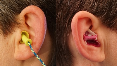 Foto: Links: Vorgeformte Stöpsel aus Silikon oder Kunststoff können ohne Zusammendrücken in den Gehörgang eingesetzt werden. Rechts: Eine Otoplastik wird anhand des Ohrabdrucks des Benutzers angefertigt.