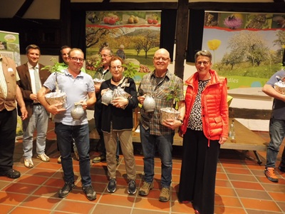 Die Sieger durften als Auszeichnung einen schön gestalteten Mostkrug in Empfang nehmen. Alle Teilnehmenden bekamen am Ende der gelungenen und kurzweiligen Veranstaltung Urkunden überreicht. Die zehn Besten,darunter natürlich die Sieger,bekamen von Herrn Jochen Heinz,dem Ersten Landesbeamten des Landkreises Göppingen,„Siegerbäumchen“ überreicht. August Kottmann hatte extra für diesen Anlass Bäumchen mit alten Mostobstsorten veredelt. Ein herzliches Dankeschön für die Durchführung dieses Events an die Fachberatungsstellen für Obst- und Gartenbau der Landkreise Göppingen und Esslingen sowie allen weiteren Mithelfenden.