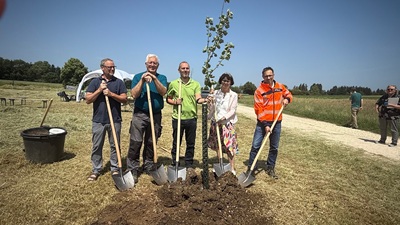 Foto: (v. l.) Detlev Heinzmann (ObstArche),August Kottmann (ObstArche),Jürgen Böhringer (ObstArche),Christine Baur-Fewson (Autobahn GmbH),Richard Rau (Autobahn GmbH); Bildquelle: Die Autobahn GmbH Niederlassung Südwest