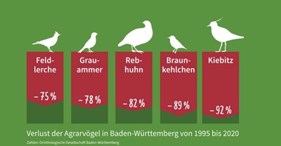 Enssle betont: „Jetzt liegt es am Landesagrarministerium,diese Chance zu nutzen und das Gesetz wirkungsvoll für Natur und Landwirtschaft auszugestalten. Wie nötig das ist,zeigt sich auch bei uns im Südwesten. Vielen Arten der Feldflur geht es schlecht: Die Bestände des Rebhuhns sind innerhalb von drei Jahrzehnten in Baden-Württemberg um 82 Prozent zurückgegangen,die des Braunkehlchens um 89 Prozent,die des Kiebitzes sogar um 92 Prozent. Selbst die Bestände der einst sehr häufigen Feldlerche sind im selben Zeitraum um mehr als 70 Prozent eingebrochen (siehe Grafik). Das zeigt,dass Baden-Württemberg trotz Biodiversitätsstärkungsgesetz in der Landwirtschaft noch viele Hausaufgaben zu machen hat. Die Wiederherstellungsverordnung sollte der Minister daher als Chance sehen,um gemeinsam mit Landwirtschaft und Naturschutz die Resilienz unserer Ökosysteme zu stärken und damit auch die Landwirtschaft widerstandsfähiger gegen Extremwettereignisse wie Trockenheit,Hitze und Starkregen zu machen.“