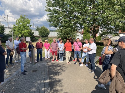 Dritte und letzte Station dann die neue Ortsmitte,die frühere Heimat der Firma Neuburger. Werner Staudenmayer hatte sich genauestens vorbereitet. Hümeyra Mrazic hatte für anschauliche Bilder gesorgt. Der Gemeinderat erzählte von den Anfängen 1855 der Tuchfabrik Borst,und dem Übergang zu Borst’s Erben um Max Neuburger aus Ulm. Die einzige jüdische Familie im Ort verlor 1938 die Fabrik durch ‚Zwangs-Arisierung‘ und konnte noch nach New York auswandern. Von dort aus übernahmen sie nach dem Ende der Nazi-Diktatur wieder ihr Eigentum. Die Kunstlederproduktion gewann an Bedeutung. Die mitten im Ort mit Schornstein,Kohlebunker,Mühlkanal und Produktionsgebäuden dominante Firma ging dann als Zweigwerk an die Eislinger Kaliko bzw ‚Conti AG‘. Bereits 1970 kaufte die Gemeinde das Areal als Flächenreserve und im Übergang zu den 80ern entstand die ‚neue Mitte‘ mit Marktplatz,Wohnungen,Geschäften und einem Anlagensee.