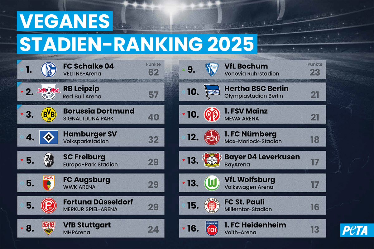 Die Saison 2024/25 ist in der Fußball-Bundesliga und 2. Bundesliga beendet,die Meister stehen fest – doch eine Entscheidung abseits des Rasens steht noch aus: Wer holt sich den Titel für das vegan-freundlichste Fußball-Stadion? Bereits zum 15. Mal hat die Tierrechtsorganisation PETA das Angebot veganer Speisen in den Stadien der Bundesliga bewertet – und erstmals seit 2019 auch die Clubs der 2. Liga unter die Lupe genommen. Das Ergebnis: Der FC Schalke 04 kann sich mit seiner VELTINS-Arena den Platz an der Spitze der Tabelle zurückerobern.