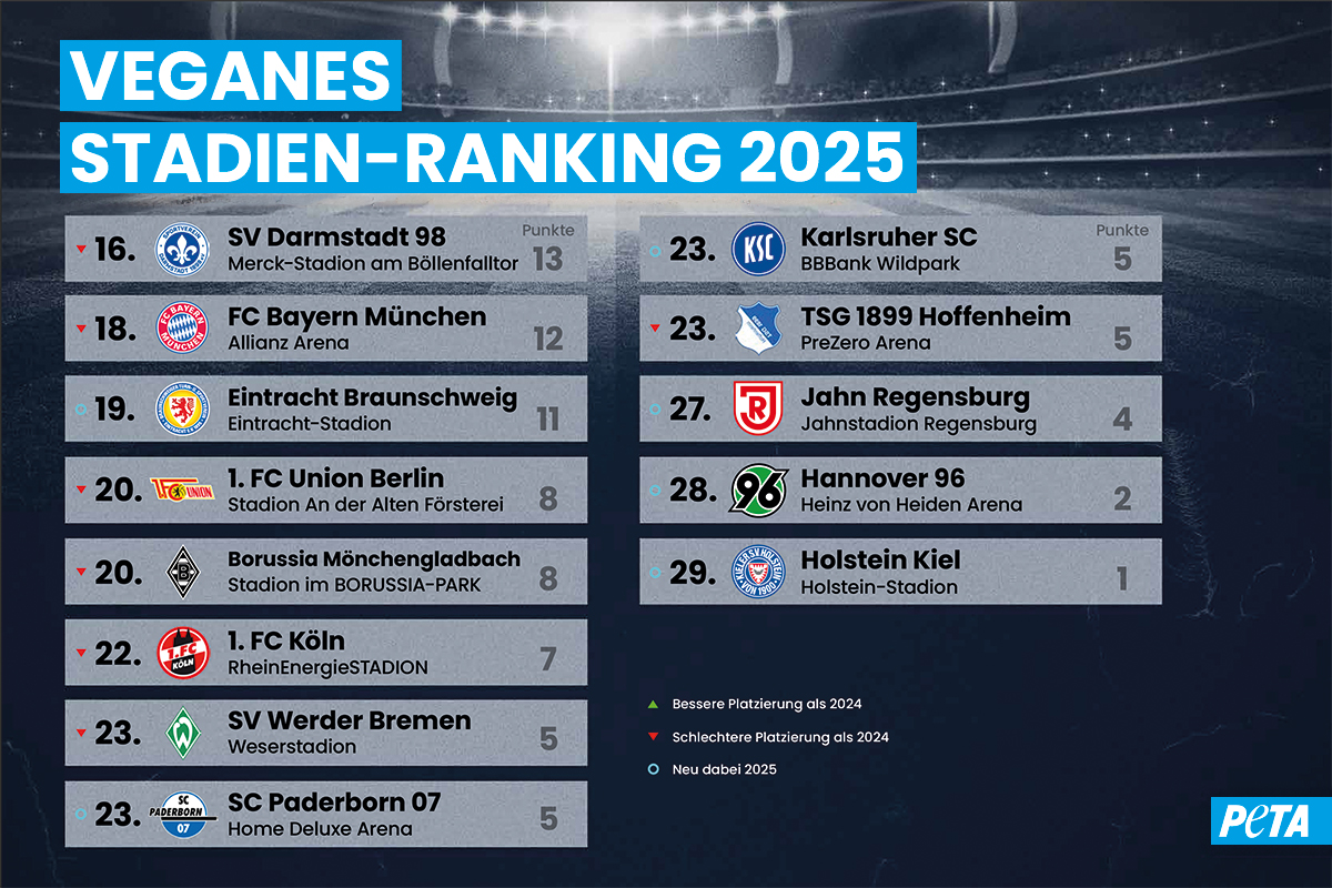 Pflanzlich punktet: PETAs Stadien-Ranking 2025 kürt vegan-freundlichstes Stadion der Fußball-Bundesliga – erstmals seit 2019 auch Zweitligisten bewertet