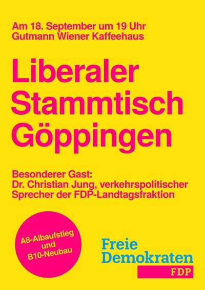 Der nächste „Liberale Stammtisch Göppingen“ findet direkt in der ersten Woche nach den Schulsommerferien am 18. September um 19:00 Uhr im Gutmann Wiener Kaffeehaus am Bahnhofsplatz in Göppingen statt.
