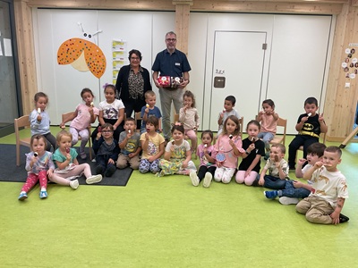 Zu Beginn der Ferienzeit überraschten Oliver Marzian,Fachbereichsleiter Bürgerdienste,und Andrea Mönich,Sachgebietsleitung Frühkindliche Bildung,alle Kita-Kinder und das Personal mit einem leckeren Eis.