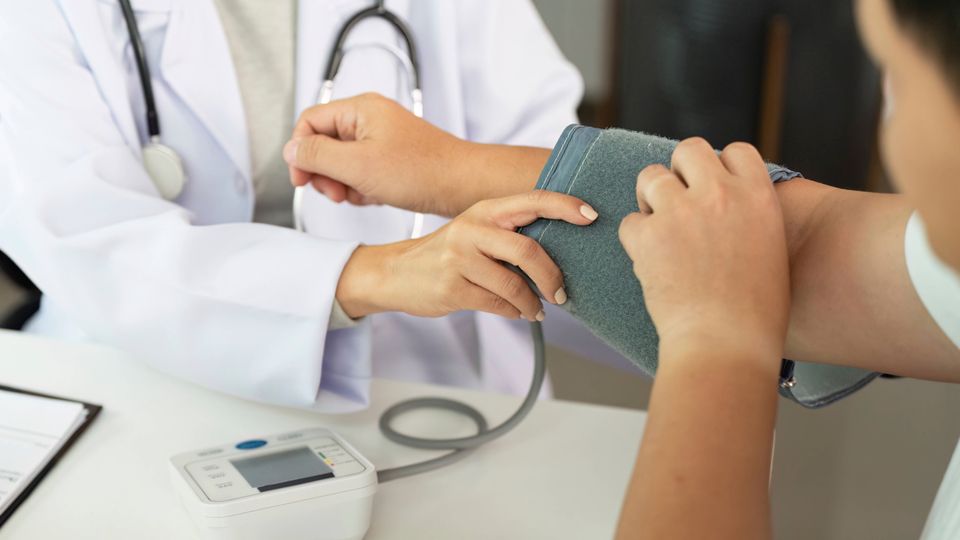 Ärztin misst Blutdruck: Ein zu hoher Blutdruck bleibt oft unentdeckt,ist aber ein Risikofaktor für einen Schlaganfall