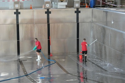 Foto (Bildquelle: Stadt Eislingen): Die Sommerpause wird genutzt,um die Edelstahlbecken zu reinigen.