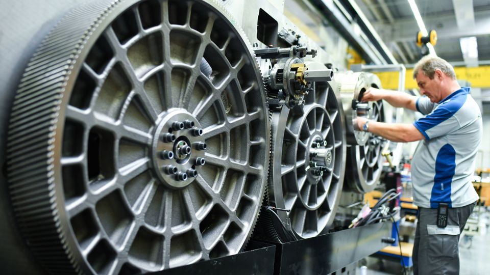 Ein Mitarbeiter arbeitet im Werk der Heidelberger Druckmaschinen AG in Wiesloch