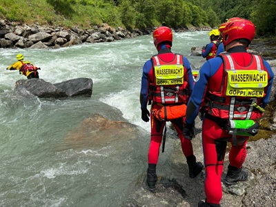 Im Wurfsack ist eine Leine,ein Ende davon bleibt beim Werfenden,der den Sack in den Fluss zu einem zu Rettenden wirft,der so herausgezogen wird. Bei der „Sprungrettung“ springt ein angeseilter Helfer in den Fluss,schwimmt eine längere Strecke und rettet den in Not Geratenen. Geübt wurde auch im Inn-Zufluss Sanna. „Die Sanna ist mit rund 15 Metern nicht so breit wie der Inn,so Tobias Neugebauer,Leiter der DRK-Wasserwacht. Dafür aber wilder und mit einer noch stärkeren Strömung. Die Wasserretter bauten eine Seilbahn über den Fluss,an dem die Retter das Gewässer überquerten,um sich mit der Strömung zum Unglücksfall im Wasser ziehen zu lassen.