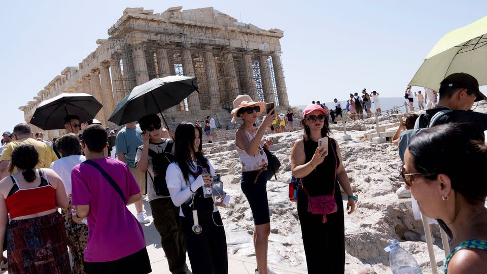 Touristen während einer Hitzewelle in Griechenland: Schirme als Schutz gegen die Sonne