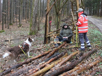 Drei Vermisste, die wahrscheinlich medizinische Hilfe benötigen, müssen in einem weitläufigen Waldstück gefunden werden. Diesem Szenario stellten sich die Rettungshundeteams des DRK-Kreisverbandes bei einer Übung am Helenenhof. Die Border Collie Hündin Arya kann es kaum erwarten, die Spur der vermissten Person aufzunehmen. Trotz Kälte und Schneeregen zieht sie, kaum dass sie